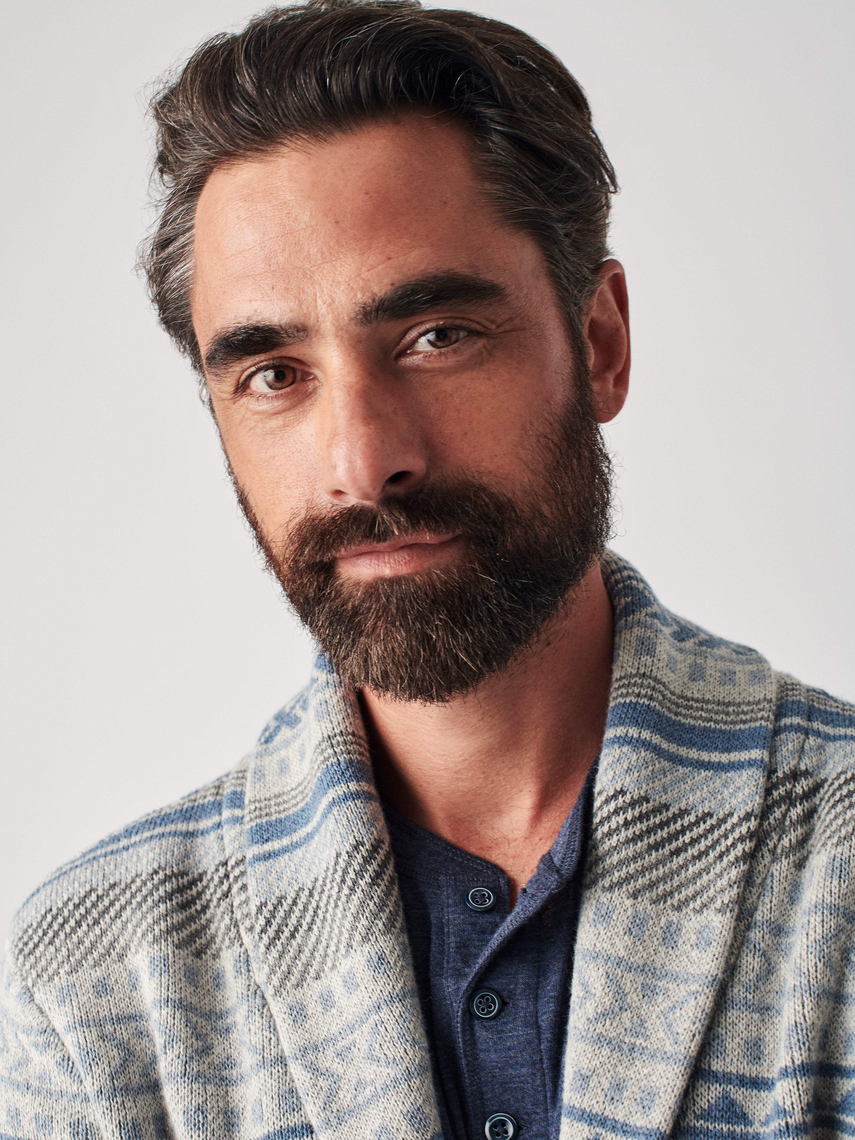 An everyday staple, this soft cotton shawl-collar cardigan is ideal for year-round comfort and ease of wear. Knit with five different colors of heather yarn to create an intricate pattern, it’s both stylish and pulled together but with a cozy, laid-back sensibility. The pattern was created by Bethany Yellowtail, an LA-based fashion designer and CEO of B.Yellowtail. Bethany is originally from the Crow Nation and an enrolled member of the Northern Cheyenne Nation in southeastern Montana.