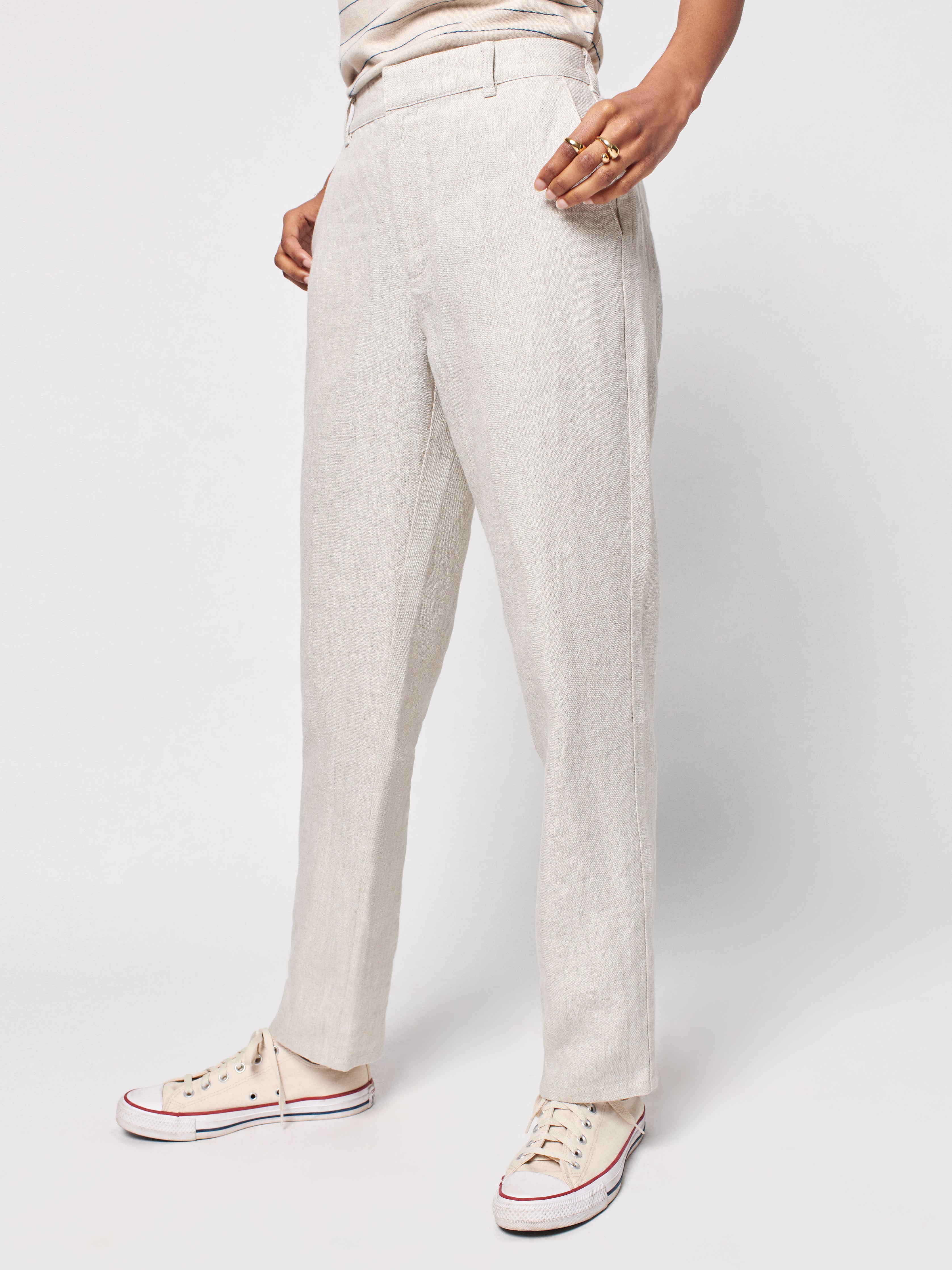We reimagined the tailored trouser for warm weather days. With a clean silhouette and a warm neutral flax color, it lends itself to versatile styling options but we love it best paired with the matching blazer for an easygoing monochrome look.