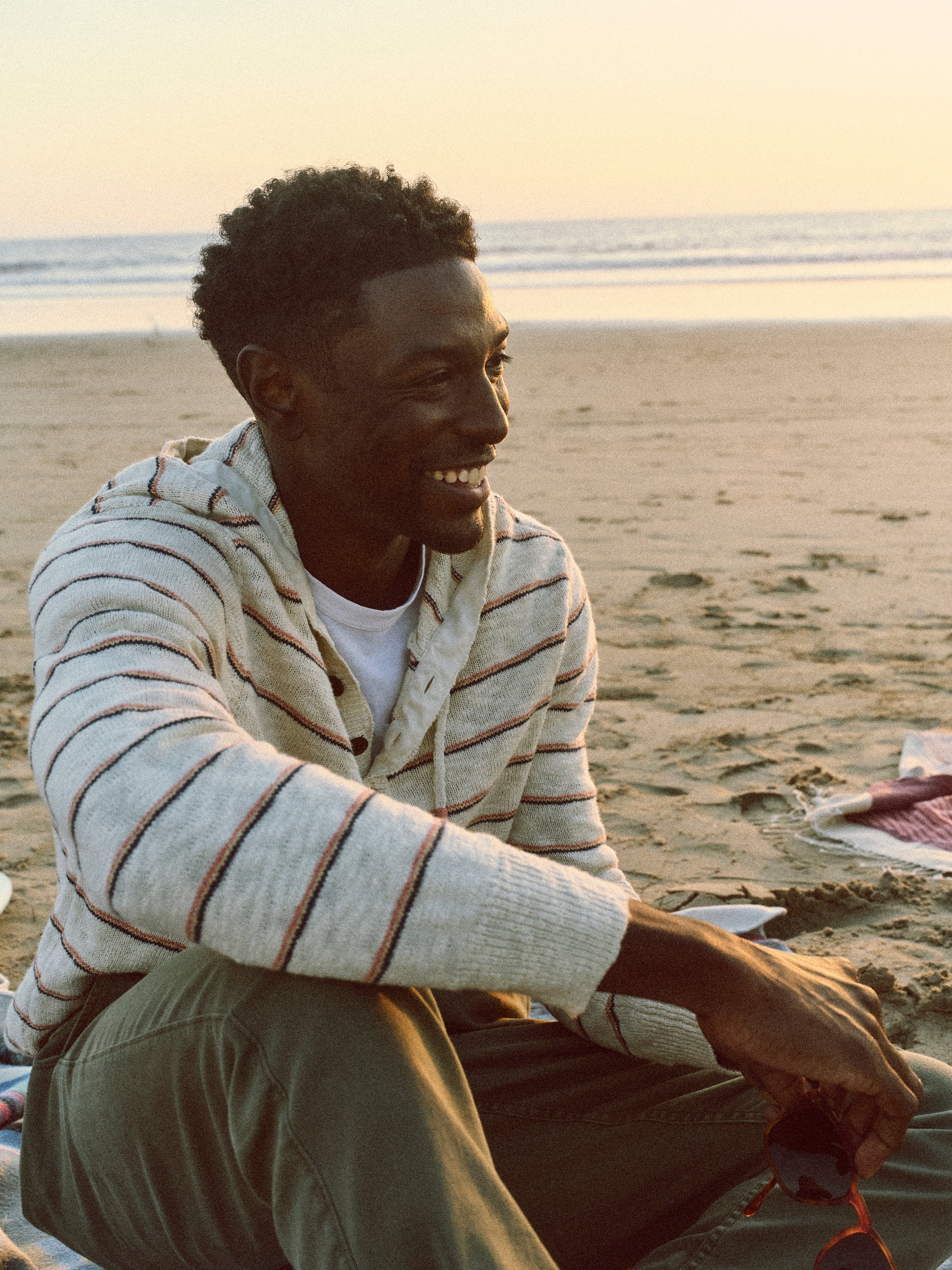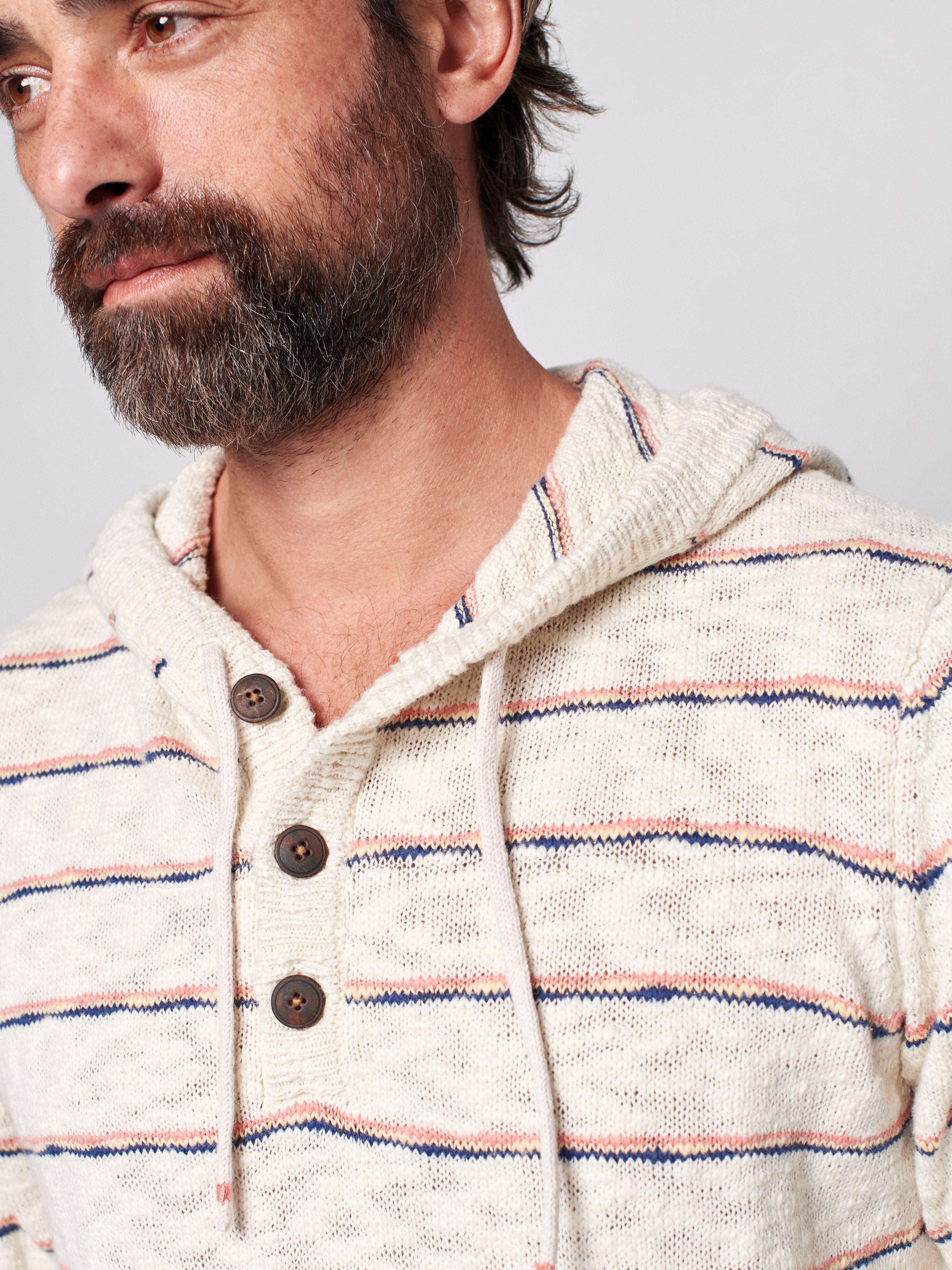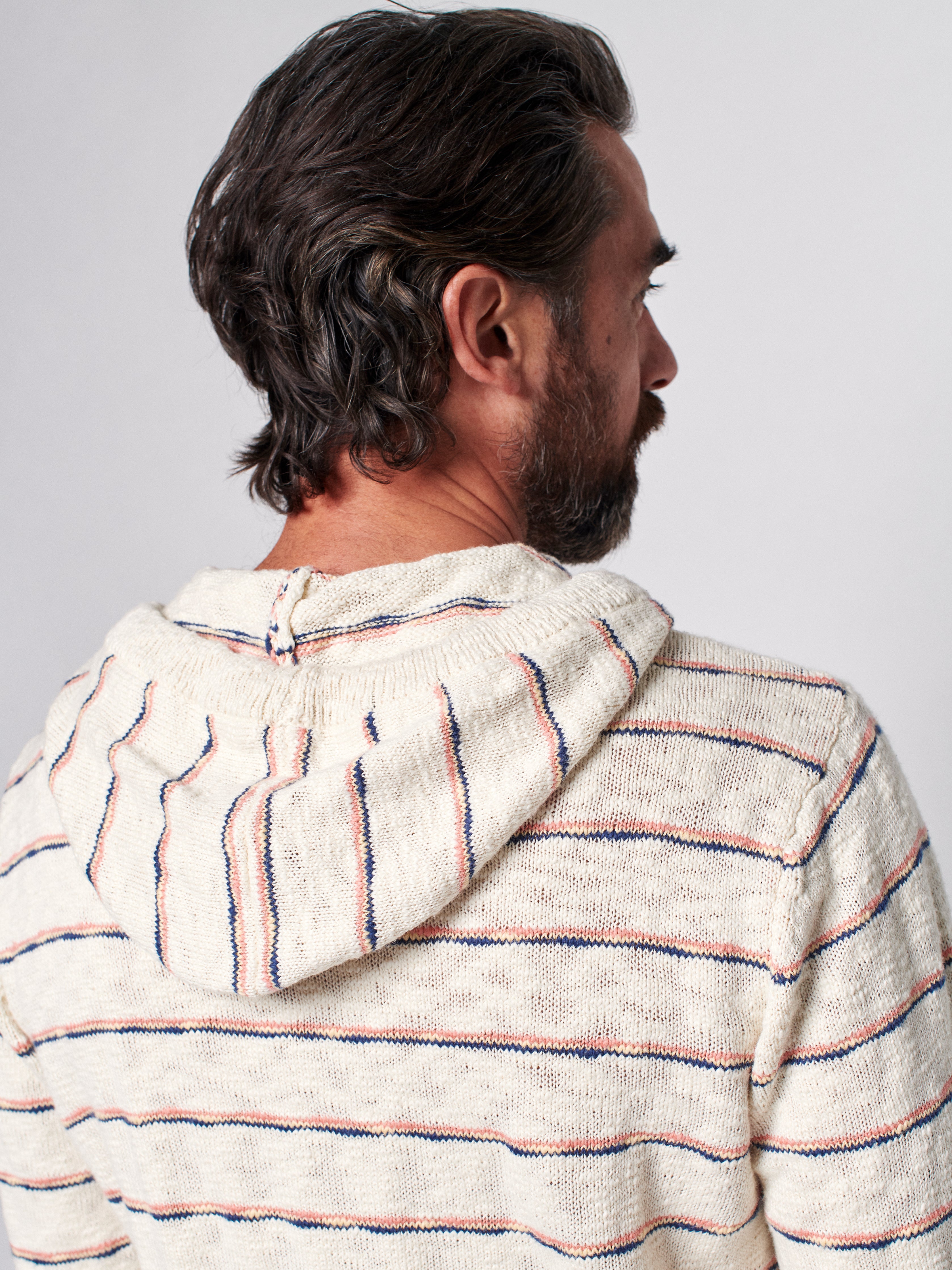We took the classic surf poncho, perfect for throwing on after a day at the beach, and made it even cooler. Knit in a slubby cotton yarn for added texture and an authentic vintage look, it's just the laid back layer you need – whether lounging on a hammock with a chilly breeze or running around town.