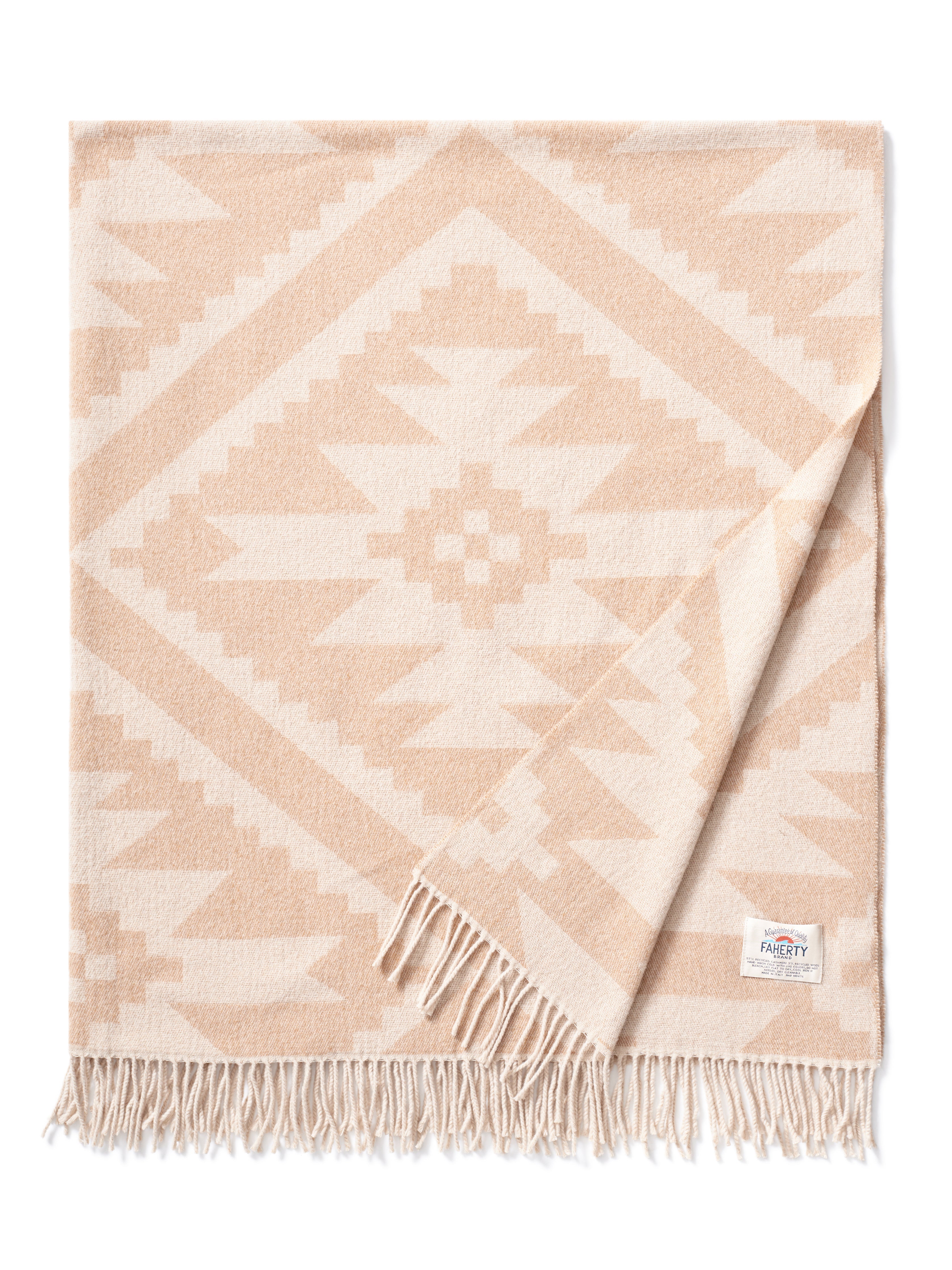 The ultimate Faherty luxury. An updated luxe version of our classic Adirondack Blanket, this custom-woven jacquard is woven in Italy from 100% cashmere that's been brushed for uber-softness. Refined, yet relaxed – our Cashmere Throw Blanket is pure joy to throw over your shoulders for fireside chats and morning cups of coffee. The quality is heirloom worthy. The weight is substantial enough to keep you warm, and last a lifetime. This exceptional design was created by our friend Doug Good Feather. An artist, veteran, author, and teacher, Doug is from the Standing Rock Lakota and Dakota Nation and is the founder of the Lakota Way Healing Center. Our ongoing partnership has enabled the Center to purchase 100+ acres of land and expand its ability to offer Indigenous spiritual practices to anyone in need of healing. According to Doug, “The process of healing is to see each other and to help each other and guide each other...companies can work together and create good medicine and good healing for communities.”