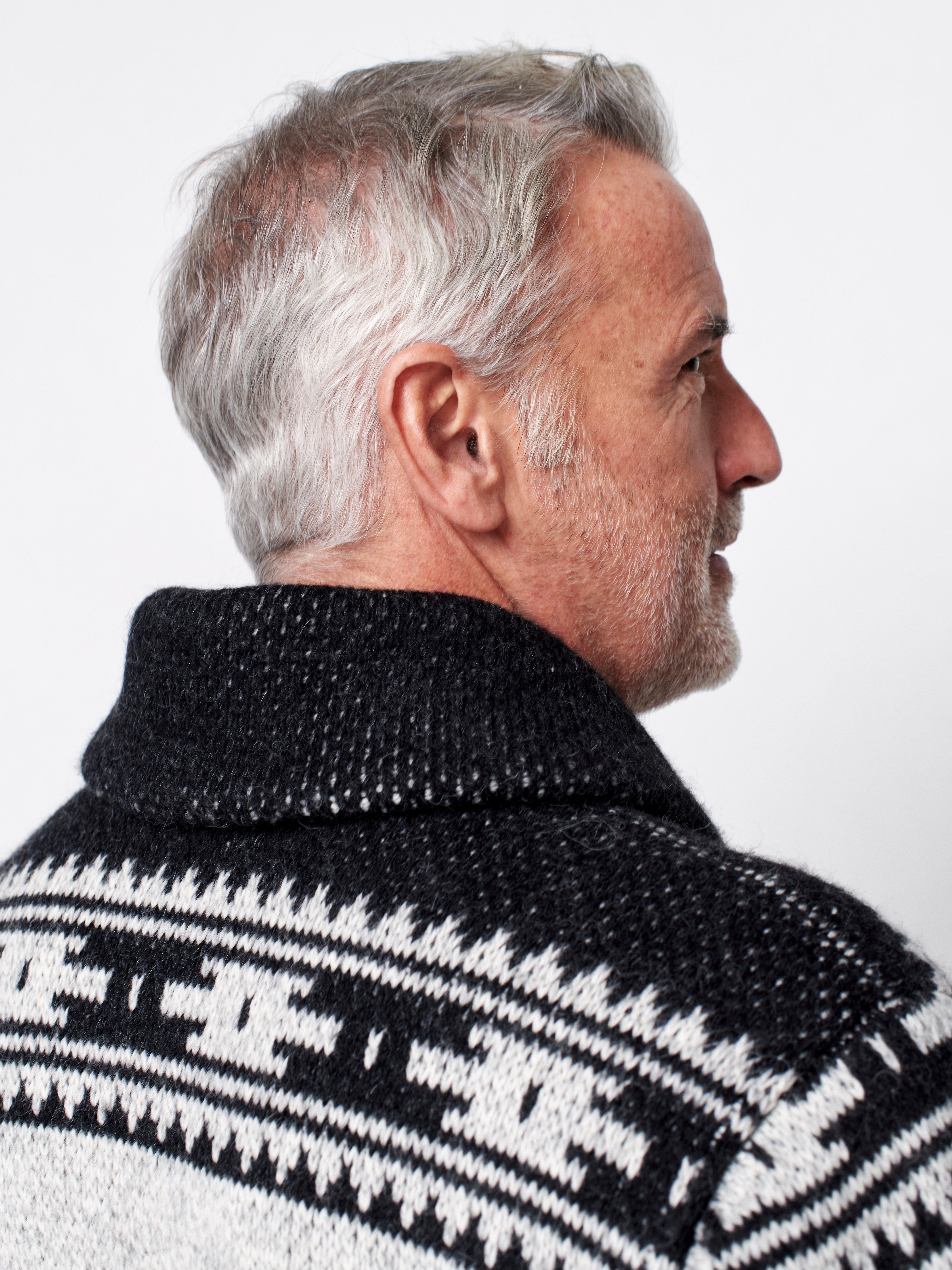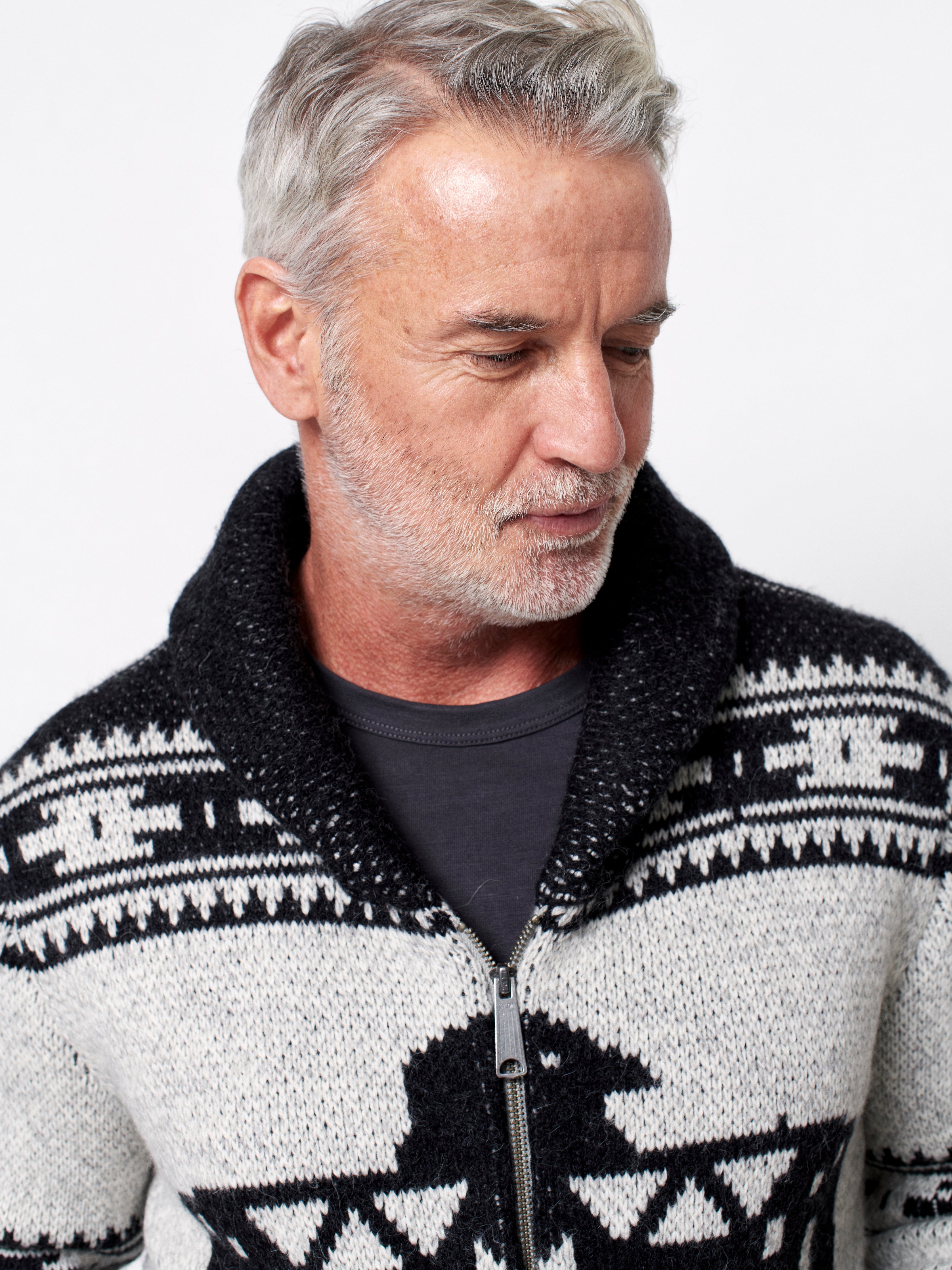 An iconic statement piece for your winter wardrobe, this cardigan was created in collaboration with Native artist Steven Paul Judd (Kiowa-Choctaw). Crafted of incredibly soft Peruvian baby alpaca, the inspired Thunderbird motif is woven directly into the sweater. In Steven Paul Judd's words: "This Thunderbird design incorporates something from both my tribes. The triangles represent the "diamond pattern" that you see in Choctaw clothing and the teepee is to represent my Kiowa side." The cardigan’s timeless shawl collar and the surprising heft and weight of the alpaca blend perfectly work together to ward off winter's chills.